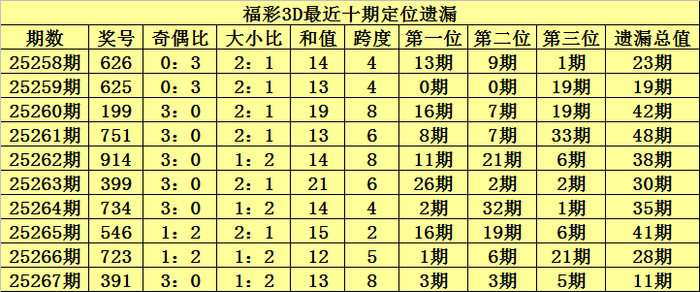 开奖回顾:福彩3D第2025267期奖号:391,百位号码遗漏3期、十位号码遗漏3期、个位号码遗漏5期,遗漏总值为11期。