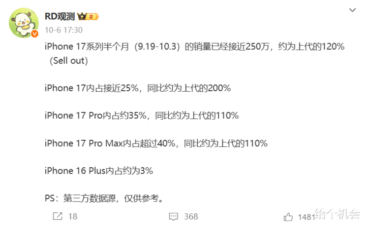 这一次的iPhone 17把牙膏挤爆了,搭载A19旗舰3nm处理器,性能比上代提升不少,又升级到IOS 26操作系统,用起来稳定丝滑,还给到120Hz自适应刷新率、二代超瓷晶面板,优势非常明显,首销销量增幅特别猛,据博主RD观测统计的数据显示,iPhone 17系列半个月销量接近250万,比上代有增强,而增长趋势最猛的就是这款iPhone 17,同比约为上代200%。